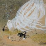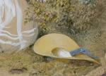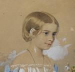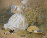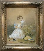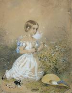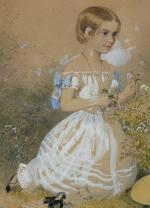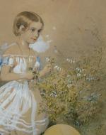 Very fine watercolour depicts a young girl picking flowers. It was executed in 1854 by well renowned Austrian genre and portrait painter Carl Goebel (1824-1899). He was a very well-known watercolour and graphic artist. His first teachers were the famous romantical artists J.A. Klein and J.C.Ehrhard. Later he studied also at the Vienna Academy. He was a very popular portrait and genre painter who travelled through Europe and Russia and worked at various European courts. Works by him belong to collections of various museums.