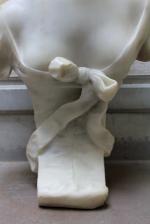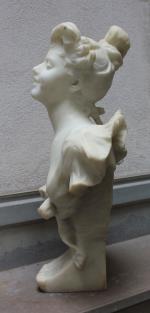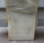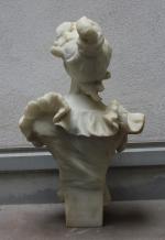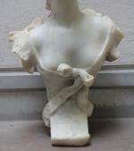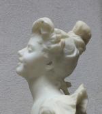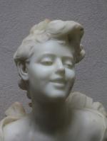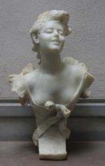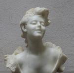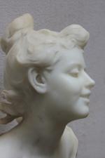 Art Nouveau marble bust of a young beauty was executed by Hippolyte Francois Moreau, French sculptor famous for his bronze and marble statuettes of young women. Born in 1832 in Dijon, France as the son of the renowned sculptor Jean-Baptiste Moreau, he grew up learning from his father’s workshop. As a young man, Moreau moved to Paris to study further under Francois Jouffroy at the École Nationale Supérieure des Beaux-Arts, first exhibiting at the Salon of French artists in 1863 and continuing to show work there until 1914. In both 1878 and 1900, he won medals for his work—large-scale, decorative pieces such as vases and statuettes—at the Universal Exposition in Paris. Among his notable sculptures is his 1880 statue of the celebrated French mathematician Alexis Clairaut, which now permanently occupies one of the facades of the City Hall of Paris. He died in 1927 in Neuilly-sur-Seine, France, and today many of his works are collected in the Museum of Fine Arts in Dijon.