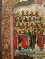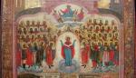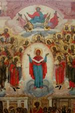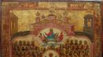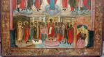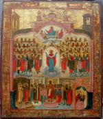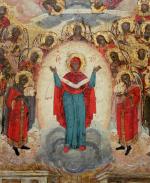 Large-format and delicate icon Our Lady of Pokrov with Romanos Melodos, Russia, 18th century, egg tempera on gesso on wood, partially gilded. Upper half with depiction of Mary in Gioriole-protection and intercession, lower half with Romano's Melodos, important hymn poet of the eastern church.