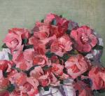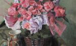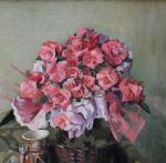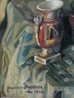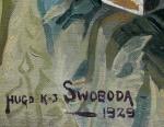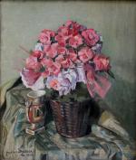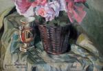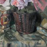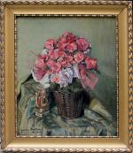 Still life with flowers in a basket and a porcelain vase from Art Deco epoch was executed in 1929 by Austrian landscape and still life painter Hugo K.J. Swoboda, who was active in 1920s - 1930s.