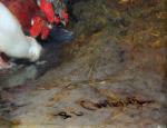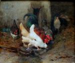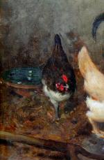 Nice painting with chickens in the barn was executed by good listed French landscape and animal painter Léon-Philibert Couturier (1823 Chalon-sur-Saone - 1901 Saint-Quentin/Aisne). He studied by Charles and Jean-Claude Nicolas Couturier; since 1844 - at the Fine art Academy in Paris by Francois Edouard Picot. Portraits, genre, since 1853 - country life and animalistic paintings. worked as illustrator by different magazines and news papers.