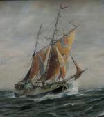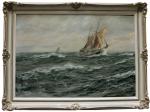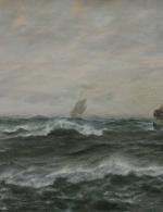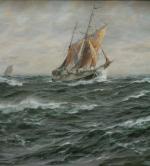 Large marine painting with sailing boats was executed by good listed German painter Patrick von Kalkreuth (1898 in Kiel - 1970 in Starnberg). He was the son of NN. Dunbar and the Elizabeth, née Block (1866–1931). His mother Elisabeth married the second marriage in Hanover in 1931 to the royal Prussian government assessor Dr. legal Richard von Kalckreuth (1878–?), First Lieutenant and Knight of Honor of the Order of St. John.Stepfather Richard von Kalckreuth adopted his wife´s two sons - Patrick, now 36 years old, and the younger Frederik - by contract dated April 4, 1935 at the District Court of Berlin-Charlottenburg.Patrick von Kalckreuth lived in Düsseldorf and Berlin, among other places, but the North Sea inspired his motifs. A landscape and marine painter, he became known for his oil paintings of surf and sea themes.