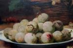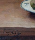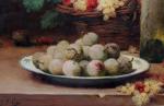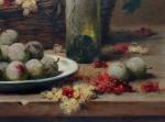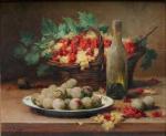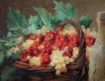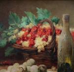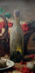 Still life with a basket of red currants, plums and wine bottle was executed by French painter Leon Charles Huber (1858-1928), who specialized in animals, in particular cats. Huber was also known for helping the poor by offering food and other services every day from his studio. In addition, Huber tutored many young artists. Born in Montmartre, Paris, he studied painting at L’Ecole des Beaux-Arts with Jules Grun, who sketched his portrait on the left. He exhibited his animale works at the Salon of French Artists from 1887. He won numerous awards for his art, and his works are in numerous private collection around the world.