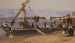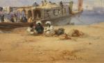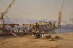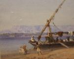 Coastal scene on Nike with a sailing vessel dahabie  was executed in 1869 by famous Austrian landscape painter and orientalist Bernhard Fiedler ( 1816 Berlin - 1904 Triest ).
