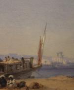 signed Bh. Fiedler and dated 1869 lower  left, titled in German by the author: Dahabie am Nil, lower right.
