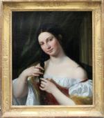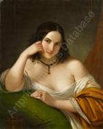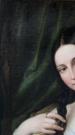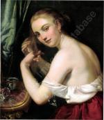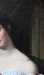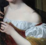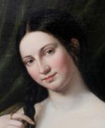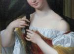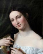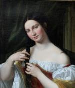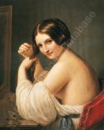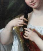 Romantical portrait of a young Italian beauty at the hairdresser was executed around first quarter of 19th century and despite the absence of a signature, is a completely identical work of Italian Romanticist, portrait, nude, genre and oriental painter and engraver Natale Schiavoni (1777 Chioggia - 1858 Venice). Mainly depicting historical paintings and portraits . Many of his paintings depict seductive nubile women .