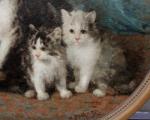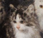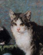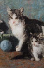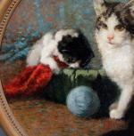 Animalistic painting with mother cat and three kitten was executed around 1890-1900 by French painter A.Bechard, who represented with a painting in the artprice date bank (sold for 3200 € by auction house Wannenes, Genua on 20.12.2020).
