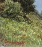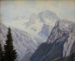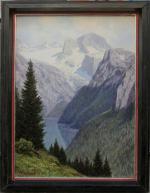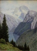 This is the pair to the previous item no. 7283. it depicts view of the lake Gosausee in Austrian Styria and was executed by listed Austrian landscape painter Josef Ferdinand Benesch (born in Vienna, Austria in 1875). He studied in Vienna and Paris and principally painted portraits, landscapes and architectural views as well as lithographs and etchings.