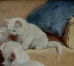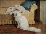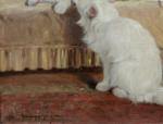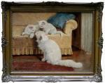 Lovely cats painting by good listed Hungarian genre and animal painter Gabrielle (Gabriella) Rainer-Istvanffy, she was born 1877 in Budapest, Hungary. The artist´s speciality was pets, whom she painted with great devotion.