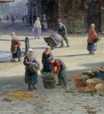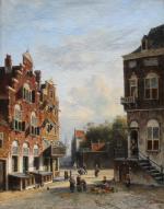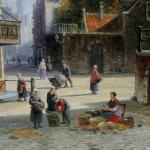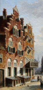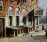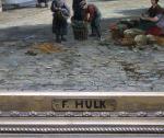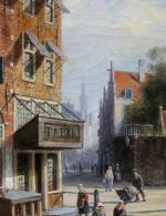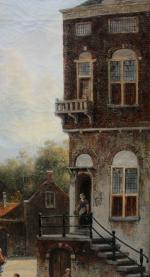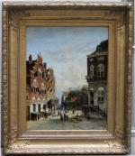Large cityscape painting with street scene in a Dutch city ( Amsterdam?) was executed by one of prominent Dutch painter Johannes Frederik Hulk Sr. (1829 – 1911) was a Dutch painter, draftsman, photographer, and owner of a paint supplies store. Hulk was born in Amsterdam in 1829. He was the youngest son of the merchant Hendrik Hulk and his English wife Mary Burroughs. He received painting lessons from his older brother Abraham and from Kasparus Karsen. As a painter he mainly painted landscapes, seascapes, cities, villages, and harbors. He gave painting lessons to his son Johannes Frederik "John" Hulk Jr., and to Bernard de Hoog, Bertha Müller, and Elias Stark. He was a member of the artists' society Arti et Amicitiae in Amsterdam.