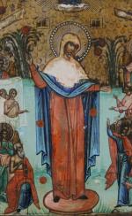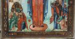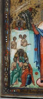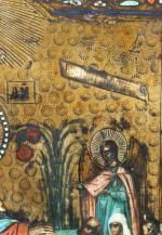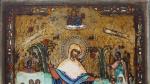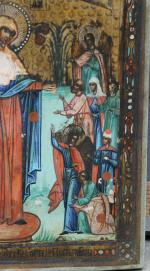 Russian Icon, late 19th century, ”Mother of God, Joy of All Who Sorrow“ is a miracle working icon celebrated throughout Russia. On July 23, 1888, during the severe thunderstorm, lighting struck a chapel at a glass factory in St.Petersburg, burning the interior walls of the church, but leaving the icon depicting Mother of God. Joy of All Who Sorrow unharmed. From the violent disturbance of the air, the icon was knocked to the floor, the poor-box broken open, and twelve copper coinsadhered to the icon in various places; afterwards many miracles were worked by the grace of the holy icon. The design of this icon depicts the Mother of God, standing in paradise with her Son above her. Along both sides of the icon , framing the Mother of God, are suppliants, asking for her intercession with angels assisting them. The 12 coins are depicted throughout the central field of the icon.