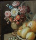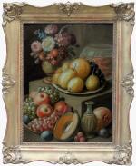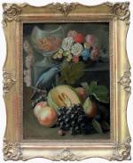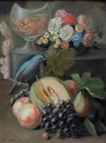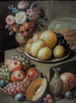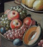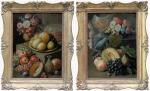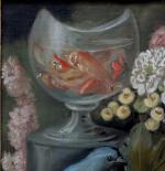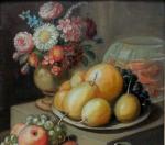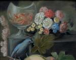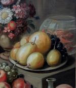 A pair of still lifes with flowers, fruits and a glass with fishes was executed in 1876 and 1877 by good listed painter of dutch origin Leopold von (van) Stoll (b.1808). He was active in 1828 in Warsaw and Cracov and in 1830 - 1834 in St. Petersburg , where he was busy designing floral arrangements for the Botanic Gardens. In 1834 the artist came back to Austria to get popular acclaim for his wonderful paintings of flowers and fruits. Ermitage in St.Petersburg have a few his still life and flowers paintings in the collection ( Cataloque of Ermitage , 1901).