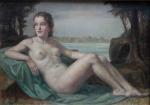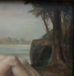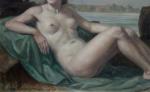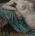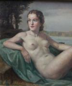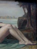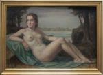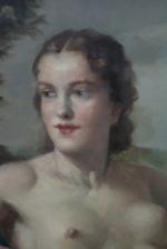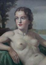 This large nude painting ( probably, artists wife as the model) was executed ca. in 1930s by renown Austrian painter Ivo Saliger (1894 - 1987). A twentieth century Austrian artist, Ivo Saliger was known both for his original paintings (nudes, madonnas, landscapes) and etchings . He moved to Vienna in 1908 and studied painting and etching techniques at the Academy of Vienna, under some of Austria’s finest artists such as Rudolf Jettmar, Ludwig Michalek and Ferdinand Schmutzer. Saliger completed his studies at the Academie Moderne, in Paris. He returned to Vienna in 1920 to assume the post of professor of art at the Academy. During the 1920’s and 1930’s, Ivo Saliger developed strong Art Deco elements within his art. These elements are clearly seen in Justice where a lawyer steadfastly defends his client who is threatened by the mob before them. This is brilliantly portrayed by the clenched hands and pointing fingers in the foreground. Behind them looms the giant figure of justice with her familiar symbols of the scales, the sword and the blindfold.When German soldiers marched into Austria, Saliger, like so many other artists, was forced to paint images in support of the Third Reich. His paintings were frequently exhibited at the ‘Great German Art Exhibition’ held annually in Munich between 1937 and 1944.After the end of the Second World War in 1945, Saliger was again free to create his own art. My feeling is that this large etching was created by the artist at this time. It would seem he made Justice with the thought of the great many Americans stationed in Germany and Austria at this time. Note, for example, that he has written, “orig(inal)” etching along the lower plate-mark, instead of the German, ‘radierung’. Also he has included the characteristic American copyright ‘c’ within the etching to the lower right. Justice was clearly a primary issue of the day, particularly within the post war trials at Nuremberg.Whatever Ivo Saliger’s reasons were for creating Justice, the strength and power of this etching cannot be overlooked. It is a truly monumental work of Art Deco imagery.
