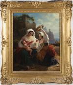 Early romantical painting with two Neapolitan women playing with baby was created in 1848 by well-known Danish artist Frederik Ludvig Storch (1805 Kjerte - 1883 Kopenhagen). This painting came from the former collection of The Royal Danish Academy of Art in the Art Hall Charlottenborg, Kopenhagen and was purcahsed on 2005 in the sale of German auction house Bodensee. On the backside of the stretcher there are old label and original inscription with ith info about this work and previous owner (in German and Danish).Frederik Ludwig Storch was a pupil of the Royal Art Academy in Kopenhagen, the artist worked in Dresden (1832-1836), in Munich (1834-36 and 1845-1851) and in Rome(1844-1845). His works are in the important European private collections and museums of Munich , Kopenhagen, Frederiksborg .