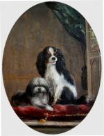 Fine miniature painting with two dogs posing on a pillow was executed ca. in the late 1850s, early 1860s, signed by the artist and was attributed as early work to the hand of famous German animal painter Carl Jutz (1838 Windfall - Pfaffendorf 1916). His works with dogs are extremely rare , we found another one (see add.photo), which is stylistic very similar to our work. His international career as an artist began only in 1867 with the move to Düsseldorf. In the same year turned out Jutz at the Paris World´s Fair, among other things later in Vienna in 1873, in Sydney, Melbourne in 1879 and 1881, British and American clients bought many of his major works, German museums in Dusseldorf, Karlsruhe, Mannheim, Breslau and Königsberg secured within the lifetime of the painter´s pictures from his oeuvre. some paintings by Carl Jutz with duck and chicken motives arrived by international auctions high results (e.g.: auction by Koller, Zurich on 23.03.2007 - 114 000 USD; Dorotheum, Vienna, 1.04.2009 - 44000 Euro ).