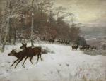 Monumental hunting painting with deers in mountains on the edge of the winter forest was executed by prominent German wild animal and hunting painter Johann Christian Kröner (1838 Rinteln/Weser - 1911 Duessseldorf ). Kröner worked by his brother in his decoration workshop as an apprentice and was able to devote himself to art cince 1861. He went first to Munich, in 1862 to Düsseldorf, and was there only through self-study and frequent trips to Upper Bavaria, Thuringia and especially Westphalia to a landscape and animal painter of eminence, which (he was a hunter) was observed the hustle and bustle of the hunted game in the rest in dramatic moments, and to describe characteristics with sharp white.His landscapes are characterized by fine tuning and strong staining. Especially he is able to play the picturesque morning fog. His main field of study are the Teutoburg Forest. From his very carefully treated paintings are the most important: "Deer after the fight "(1870), " Wild sows in winter", "Stags after the rut "(1876), "Autumn Landscape with deer in the morning" (1877, Berlin National Gallery), "Through their fingers" (1879). He has also made numerous drawings and etchings of the woodcut. Kroner has the great gold medal of the exhibition in Berlin and was a member of the Berlin Academy and Royal Professor.