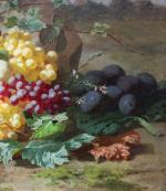 Masterfully still life with grapes, pumpkin, peaches and plums was executed by renowed and high listed Belgian flower painter of 19th century Henri Robbe (1807 Courtrai - 1899 Brussels). Painter of flowers and fruit. After having tauht music in Paris for many years, he joined his brother Louis Robbe in Brussels in 1840. From then on, he painted and took part each year in the Brussels Exhibitions and was very succesful. He also exhibited in Paris, London and Vienna. FRepresented in the Museums in Ghent, Courtrai, Brussels and Mons.