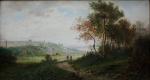 Far view of the Czech town Chlumce nad Cidlinou ( on the backside of the stretcher is original title in Chech: Chlumec nad ....), where the author of the painting, Czech landscape painter Ludwik Bartak ( 1857 - 1921) was born.
