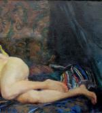 Large nude painting was executed in the early 20th Century by Good listed German painter and etcher Wilhelm Hempfing ( 1886 iSchönau (Odenwald - 1948 iKarlsruhe). Wilhelm Hempfing was a master student at the Karlsruhe Art Academy under Friedrich Fehr. He also learned etching and printing techniques in Karlsruhe from Walter Conz. Hempfing was given special importance in National Socialism, and between 1937 and 1944 he was represented with several works at the official Great German Art Exhibition in the House of German Art in Munich. At least one of his works was purchased by Hitler, namely, according to Henry Picker, the nude "Seated Blonde", which bore a striking resemblance to Eva Braun.[2] Also, according to the "NS-Tageszeitung Mannheim und Nordbaden", the painting "Portrait of a Girl", also at the Great German Art Exhibition in Munich in 1938.[3] His oeuvre mainly includes landscape and nude paintings, but also portraits and flower paintings. Hempfing was also very productive with his own etching technique, which was strongly influenced by W. Conz.
