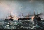 This monumental battle painting depicts The Battle of Lissa. This battle took place on 20 July 1866 in the Adriatic Sea near the Dalmatian Island Vis (Italian: Lissa) during the Third Italian War of Independence and was a significant victory for an Austrian Empire force over a numerically superior Italian force. It was the first major sea battle between ironclads and one of the last to involve deliberate ramming. The Italian navy fired roughly 1450 shots during the engagement but failed to sink any Austrian ship and lost two ironclads.