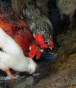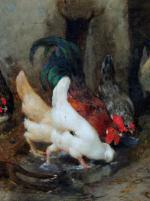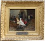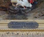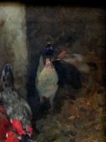 Nice painting with chickens in the barn was executed by good listed French landscape and animal painter Léon-Philibert Couturier (1823 Chalon-sur-Saone - 1901 Saint-Quentin/Aisne). He studied by Charles and Jean-Claude Nicolas Couturier; since 1844 - at the Fine art Academy in Paris by Francois Edouard Picot. Portraits, genre, since 1853 - country life and animalistic paintings. worked as illustrator by different magazines and news papers.