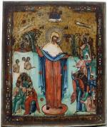 Russian Icon, late 19th century, ”Mother of God, Joy of All Who Sorrow“ is a miracle working icon celebrated throughout Russia. On July 23, 1888, during the severe thunderstorm, lighting struck a chapel at a glass factory in St.Petersburg, burning the interior walls of the church, but leaving the icon depicting Mother of God. Joy of All Who Sorrow unharmed. From the violent disturbance of the air, the icon was knocked to the floor, the poor-box broken open, and twelve copper coinsadhered to the icon in various places; afterwards many miracles were worked by the grace of the holy icon. The design of this icon depicts the Mother of God, standing in paradise with her Son above her. Along both sides of the icon , framing the Mother of God, are suppliants, asking for her intercession with angels assisting them. The 12 coins are depicted throughout the central field of the icon.