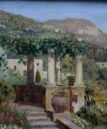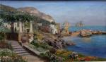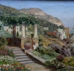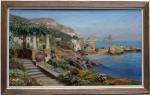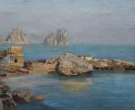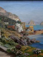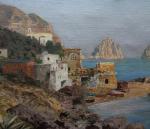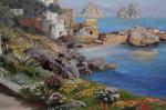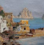 Monumental view of island Capri with Faraglioni rocks on the background. This colourfully painting was executed in the early 20th century by renowned and good listed Austrian landscape painter Alois Arnegger (1879-1967). The artist studied at the Vienna Academy under R. Russ and Eisenmenger and became his glory and popularity among collectors around the world for his panoramic italian views and landscapes from Alps. Other works by A. Arnegger see under item numbers: 4978, 5493, 5494, 5847, 6702, 6950, 7189 and 7231.