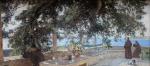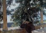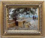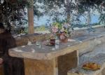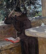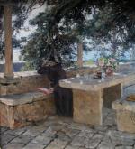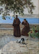 Impressionist painting with monks on the sunny seaside terrace was executed in 1893 by famous Austrian painter Eduard Ameseder (1856 Czernowitz - 1938 Vienna. The artist was a son of the engineer Theodor Ameseder. He received his schooling at the high school in Leutschau and the secondary school in Pancsova. After graduating from high school, he first attended the Vienna Art Academy, where he was a student of Christian Griepenkerl (1876 to 1879) and Eduard Peithner von Lichtenfels (1880 to 1886). He then continued his training with Gustav Schönleber in Karlsruhe from 1887 to 1891. He spent the following year in Munich.