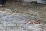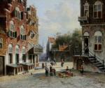 Large cityscape painting with street scene in a Dutch city ( Amsterdam?) was executed by one of prominent Dutch painter Johannes Frederik Hulk Sr. (1829 – 1911) was a Dutch painter, draftsman, photographer, and owner of a paint supplies store. Hulk was born in Amsterdam in 1829. He was the youngest son of the merchant Hendrik Hulk and his English wife Mary Burroughs. He received painting lessons from his older brother Abraham and from Kasparus Karsen. As a painter he mainly painted landscapes, seascapes, cities, villages, and harbors. He gave painting lessons to his son Johannes Frederik "John" Hulk Jr., and to Bernard de Hoog, Bertha Müller, and Elias Stark. He was a member of the artists' society Arti et Amicitiae in Amsterdam.