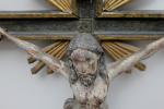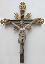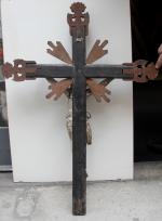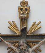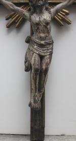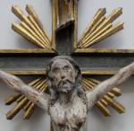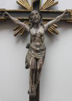 Masterfully hand-carved wooden crucifix on the wooden cross, 17th century, probably Spanish. Religious art with very details.