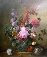 Classical still life with flowers and bird´s nest was executed in the middle of 19th century by anonym representative of renown French Flower School.