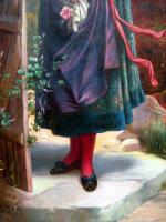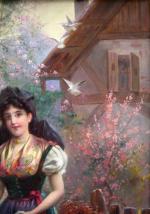 A pair to the item No. 3109. This nice scene with a girl in Austrian national folk costume was executed by Austrian painter of late 19th century H.Waldek. The artist worked under influence of other more famous Austrian genre painter of the same time Hans Zatzka (1859-Vienna-1945) and created his scenes with peasant and elegant ladies, oriental dancer and neoclassical nymphs in the same style.