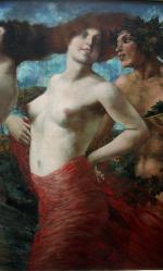 Large Art Nouveau painting with 3 beautiful bacchante was executed at the turn of 20 century by well-known Austrian genre painter Eduard Ansen-Hofmann ( 1862-1955). The artist was active in Vienna and was popular with nudes , orientalist and salon genre paintings.