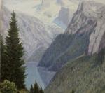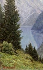 This is the pair to the previous item no. 7283. it depicts view of the lake Gosausee in Austrian Styria and was executed by listed Austrian landscape painter Josef Ferdinand Benesch (born in Vienna, Austria in 1875). He studied in Vienna and Paris and principally painted portraits, landscapes and architectural views as well as lithographs and etchings.