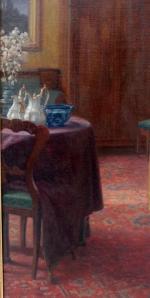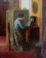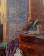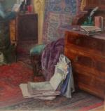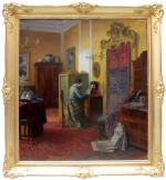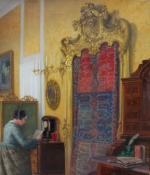 Colorfully interior painting with a art lover, examining a old drawing was executed in 1930 by renowned Austrian genre and landscape painter Karl Maria Schuster (1871 Purkersdorf by Vienna - 1953 Vienna). This work was exebited at the exhibition in 1930 of Austrian Artist Union Kuenstlerhouse. K.M. Schuster studied by Julius Berger , Leopold Carl Mueller, J.M. Trenkwald and Sigmund I´Allemand. The artist travelled for study to Egypt, America, Holland, Belgium, Switzerland, Germany and South France. In the WWI he worked s a military painter. From 1928 to 1940 he lived in Carinthia at Worthersee. He was popular with landscapes from Carinthia and interior scenes. In 1929 he was awarded with Silver Medall of Vienna Art Union "Genossenschaft der bildenden Künstler ". Gallery Makow in Klagenfurt organized in 1971 his Memory exhibition. In 1946 he recieved the Golden Laurel of the Viennese Artist Union "Künstlerhaus", whose member was he from 1903.