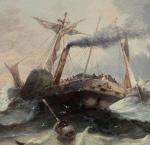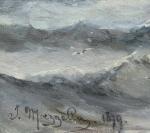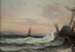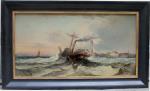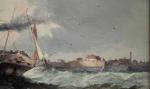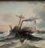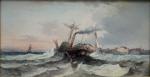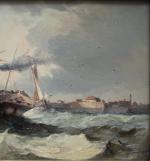 This is a pair to the next item number. Seascape with sailing ship in the stormy sea off the coast. It was executed in 1879 by listed Frwnch marine painter Jen Mazzella , who worked in the second half of 19th century and was popular with his marine paintings.