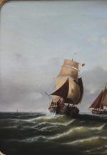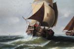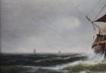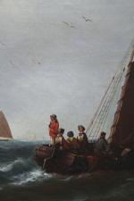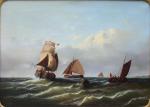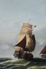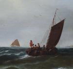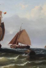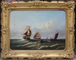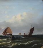 Monumental classical marine painting with Dutch fishing boats in the stormy sea. It was executed by German marine painter Johann Baptist Weiss (1812 Munich - 1879). He was famous German marine painter of the Munich School. He worked primarily in Munich and in Holland and is known for his dramatic maritime scenes, often featuring sailing ships on rough seas. Weiss's works have been traded internationally at auctions and are found in private collections around Europe.