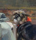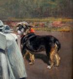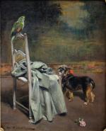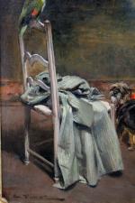 Genre scene with a dog and a parrot waiting on the boss was executed by French painter, illustrator, sculptor and draftsman Auguste Vimar (1851- Marseille - 1916)